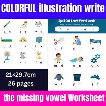 This vibrant, printable worksheet is perfect for helping young learners practice identifying and writing missing vowels in CVC (consonant-vowel-consonant) words. The resource features: